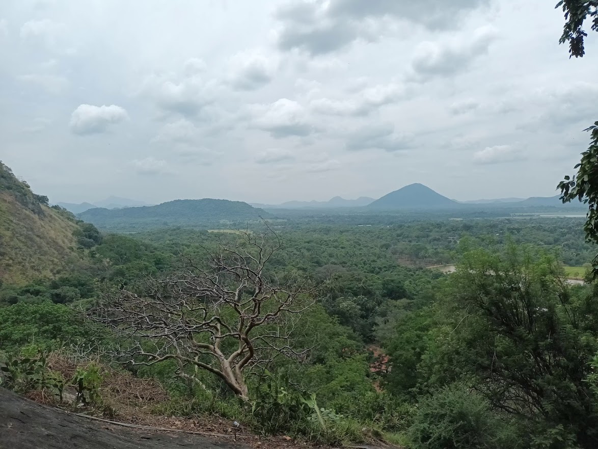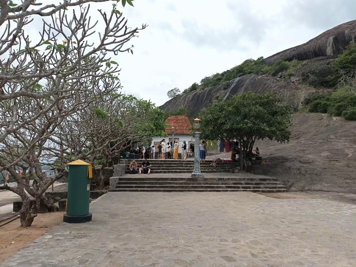 Zunächst mussten wir, wie so oft, noch ein paar Stufen auf ein Aussichtsplateau erklimmen, von wo wir eine beeindruckende Aussicht auf die umliegende Landschaft Zentral-Sri-Lankas hatten. Zwischen den ausgedehnten Wäldern erheben sich einzelne Berge aus dem weiten Grün, von denen man wahrscheinlich einen ähnlich guten Blick hat. Rechts von uns wartete auch schon der Tempeleingang. Zuerst mussten wir, wie in asiatischen Tempeln üblich, unsere Schuhe an einem speziellen Stand abgeben, und ich meine unter der Shorts unzüchtig freiliegenden Knie mit einem Sarong bedecken, bevor wir den Felsentempel betreten konnten.