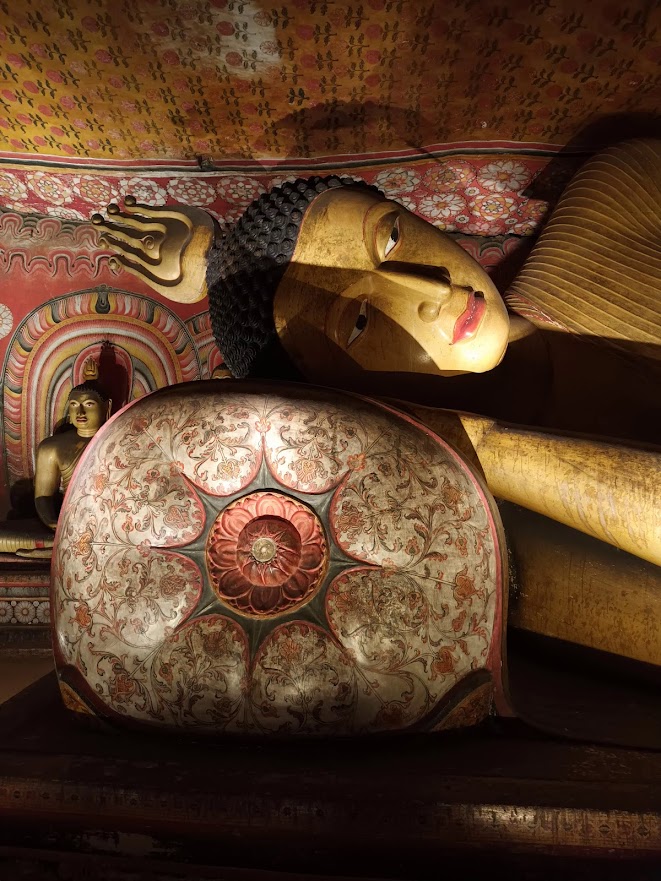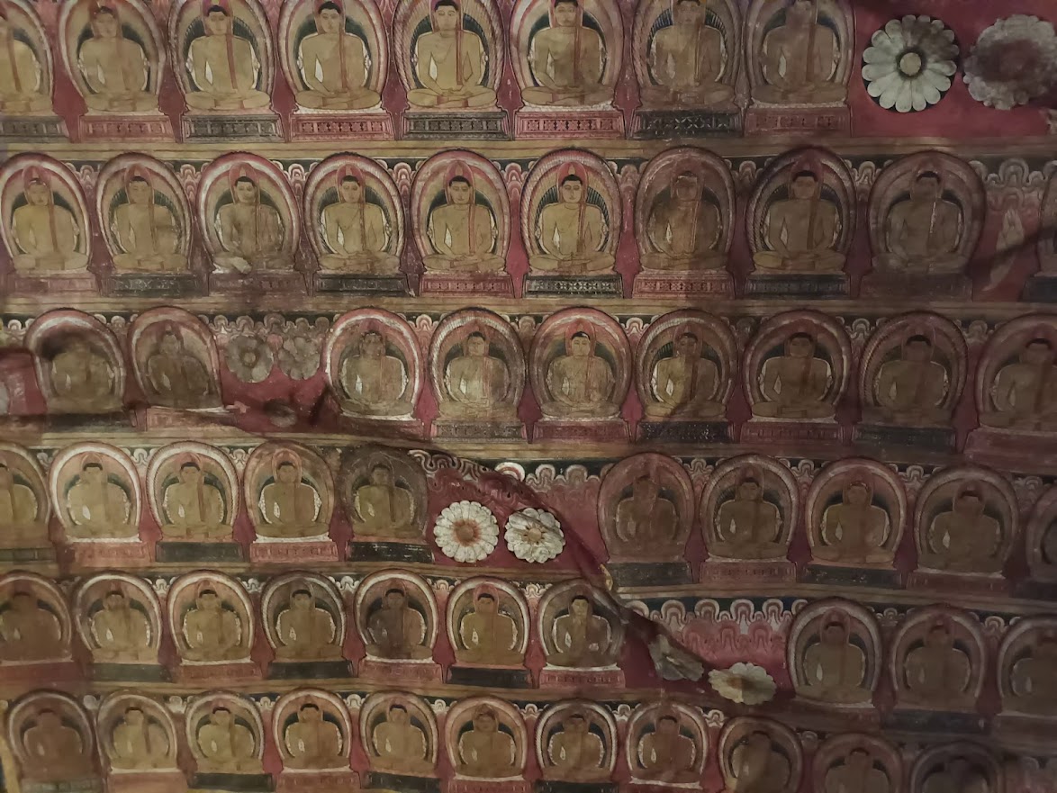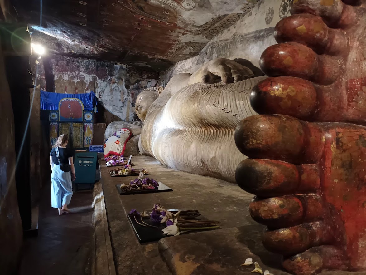 Von den Säulengängen führen Räume in den Berg hinein, die erst die wahren Größe des Tempels erahnen lassen. Schon im ersten von ihnen erwartet uns ein riesiger Reclining Buddha, der hier im felsigen Schatten erhaben seinen Platz auf einem Podest einnimmt, von den Mitbringseln der Gläubigen, wie Blumen, und kleinen Schreinen flankiert. Weitere sitzende und stehende Buddha-Statuen, teilweise in leuchtenden Farben, säumen die Wände des Raumes und fordern den Besucher zum Erkunden auf. Die Felsenwände sind mit bunten Zeichnungen von Menschen und Tieren geschmückt. Sie reichen teilweise zurück bis ins frühe Mittelalter, als der Tempel angelegt wurde, und lassen den Besucher nur staunend und fasziniert zurück. Es ist unglaublich, wie detailgetreu und farbenfroh die Bemalungen sich erhalten haben, sicherlich auch dank liebevoller und aufwendiger Restaurierung und Instandhaltung.
