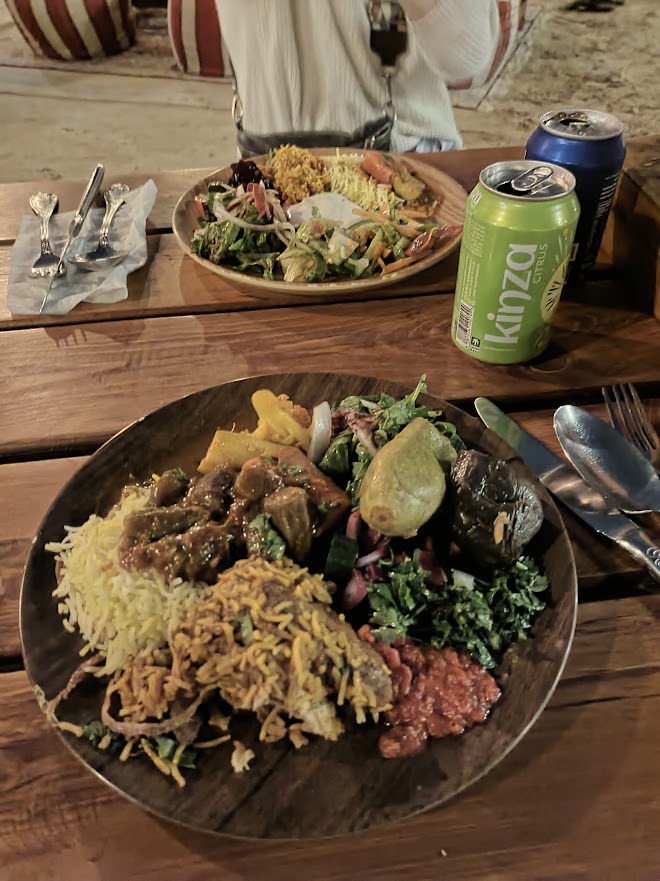 Auch wenn das hier natürlich ein von Anfang bis Ende komplett unindividuelles Erlebnis ist und man hier wohl keinen allzu authentischen Eindruck mehr vom Leben in den Emiraten außerhalb der Hochglanzstädte bekommt: Man muss schon anerkennen, dass es alleine eine organisatorische und logistische Meisterleistung ist, uns hier alle am Ende dieses Tages satt an Eindrücken und Essen, sowie hochzufrieden in der Wüste, abseits von der Zivilisation, den Tag ausklingen zu lassen.