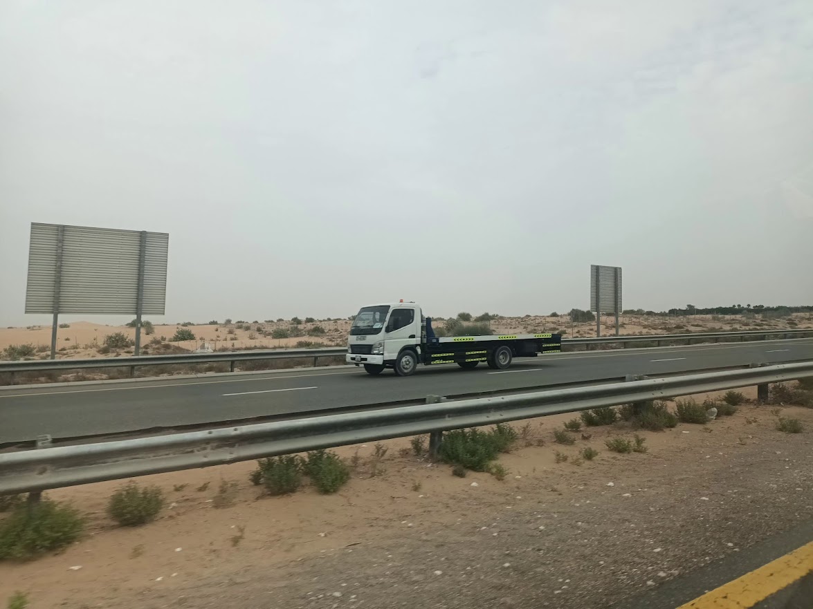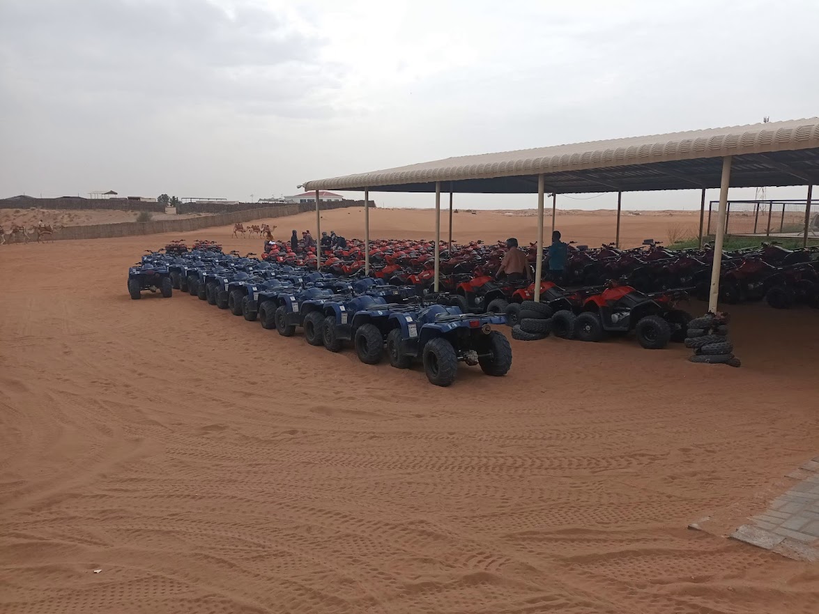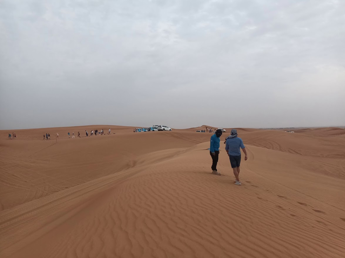 Wir beginnen unser Programm direkt vor unserem Hotel, wo uns ein klimatisierter Jeep mit acht Sitzplätzen abholt. Wir sind die ersten, und unser Fahrer fährt noch ein weiteres Hotel an, wo noch mal eine Handvoll Leute zusteigen, wie sich herausstellt, Touristen aus Bulgarien, die den heutigen Tag mit uns zusammen verbringen werden. Danach geht es in doch recht langer Fahrt hinaus aus der Innenstadt Dubais, durch die gleißende Sonne auf breiten Highways in Richtung Wüste südöstlich der Stadt. Erster Stopp ist ein von großen Sanddünen umgebenes Gelände mit hunderten roten Buggies und ein paar flachen Gebäuden. Hier haben wir die Möglichkeit, mit besagten Sandgefährten dröhnend die umliegende Wüste unsicher zu machen, oder uns bei einem kühlen Getränk einen ersten Eindruck von der Wüste zu machen. Das Wetter ist Gott sei Dank mittlerweile eher diesig, sodass de Hitze sogar ganz erträglich ist. Wir entspannen uns lieber mit einer kühlen Limo und schauen den anderen dabei zu, wie sie ihre Quads durch den Sand jagen.