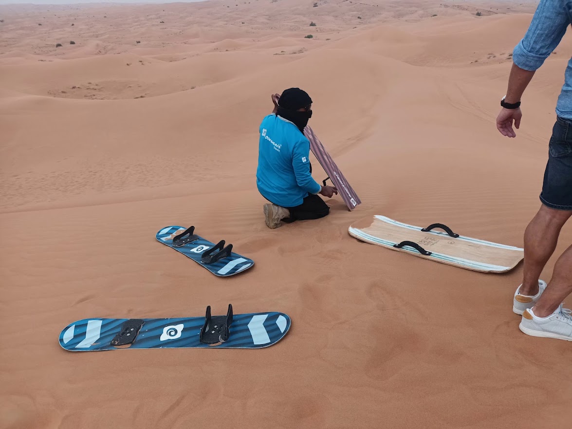 Irgendwann machen wir Halt auf einer hohen Düne, wo wir aussteigen und das tolle Wüstenpanorama bewundern können. Mit uns sind schon einige andere Jeeps hier gelandet, und alle machen sich eifrig daran, die Kulisse auf vielen Bildern zu verewigen, sich selbst und die Mitreisenden in allen Gruppierungen und Posen inklusive. Man muss schon zugeben, dass die Landschaft hier wirkt, als wäre man in einem Film gelandet, rotbraune Sanddünen, soweit das Auge reicht. Jedoch haben wir dafür nur kurz Zeit, denn schon holt unser Guide aus dem Kofferraum das Gadget für den nächsten Programmpunkt: Sandboarding. Wie beim Snowboarding auch, geht es hier darum, die Sandpiste auf einem Brett stehend mehr oder weniger elegant herunterzurutschen, und dabei möglichst nicht auf dem Hintern oder gar Gesicht zu landen. Mutig macht einer aus unserer Gruppe den Anfang und saust vergnügt den Hügel herunter, als hätte er nie etwas anderes getan. Bestimmt ein Snowboarder oder so. ALs nächstes versuche ich mich, und schaffe es tatsächlich auch einigermaßen heil unten anzukommen. Gefährlich ist das Ganze natürlich nicht, man erreicht auf dem feinen Sand kaum mehr als Schrittgeschwindigkeit, und muss nur ein bisschen die Balance halten. Einer nach dem anderen vollbringt das Meisterstück, manche noch ein zweites oder drittes Mal, und sammeln actiongeladene Urlaubsfotos und -videos. Wer sich das trotzdem nicht ganz zutraut, kann sich alternativ auch auf einem Sandschlitten, nicht viel mehr als ein Brett mit zwei Schlaufen zum festhalten, der Schwerkraft hingeben. Das Anstrengendste ist definitiv der Weg durch den Sand wieder herauf.