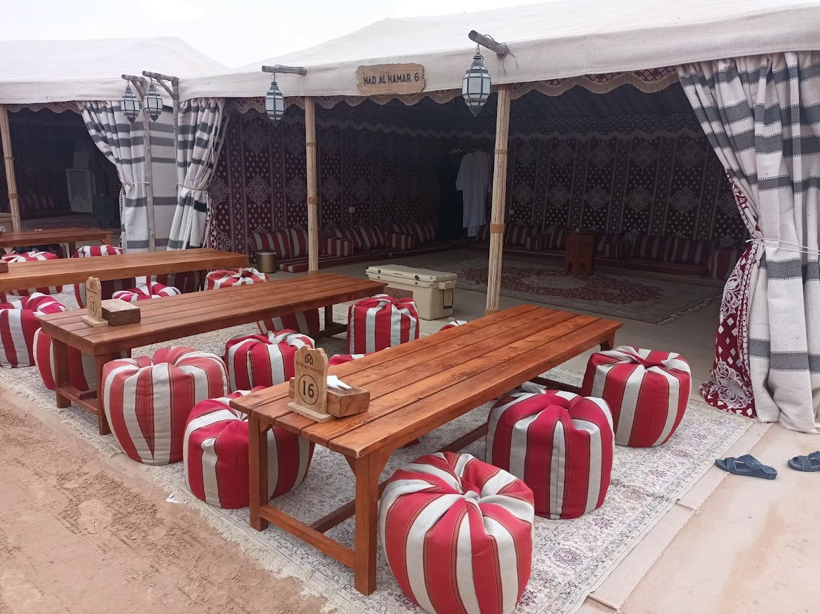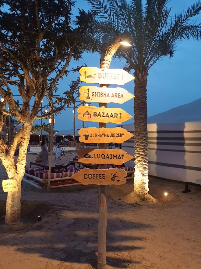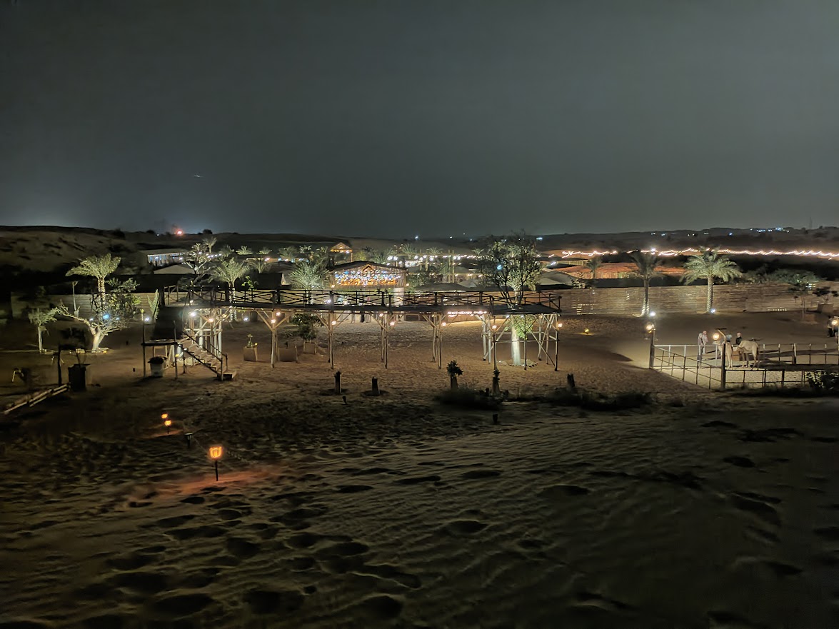 Schon bald aber steigen alle wieder in ihre Jeeps, und weiter geht es, im Konvoi noch einmal ein bisschen durch die Wüste, bis wir unseren letzten Stopp für heute erreichen: Das große Wüstencamp, eine Ansammlung großer Zelte und Unterstände, wo nach dem aufregenden Teil unseres Ausfluges nun der Gemütliche wartet. Eine Weile können wir uns an Tee und den hier allgegenwärtigen köstlichen Datteln bedienen, selbst gemachtes Brot kosten und Souvenirs erstehen. Wer Lust auf ein tierisches Vergnügen hat und von der vorherigen Schaukelei noch nicht genug hat, kann auch einen Kamelritt wagen, bevor wir zum reichhaltigen Abendessen gerufen werden. Ein riesiges Buffet mit Speisen aus der emiratischen, marokkanischen, ostasiatischen und arabischen Küche lässt eigentlich keine Wünsche unerfüllt, und die einsetzende Hektik, als helle Glocken die Eröffnung des Festmahles ankündigen, ist angesichts der sich haushoch türmenden Bergen von Essen komplett unbegründet. Ein jeder kann und muss auch ein zweites oder drittes Mal den Teller vollladen, um auch nur annähernd jedes Gericht wenigstens mal zu kosten, und schon bald fläzen hunderte Touristen satt und zufrieden an ihren Tischen in der einsetzenden Wüstennacht. Es folgt ein kleines Showprogramm mit Tanz- und Feuereinlagen, die das Camp in ein lichtdurchflutetes Spektakel im größten hier vorhandenen Zelt, dem der Sterne, verwandeln. Zwischendurch ist Zeit, sich dieses in aller Pracht von außerhalb anzuschauen, wo man auf eine Düne klettern und eine Weile das hier draußen, ungestört vom Lichtsmog der Stadt, hell strahlende Firmament bewundern kann. Man erkennt euch eine Handvoll wohl ganz ähnlicher Camps hier in der Umgebung.