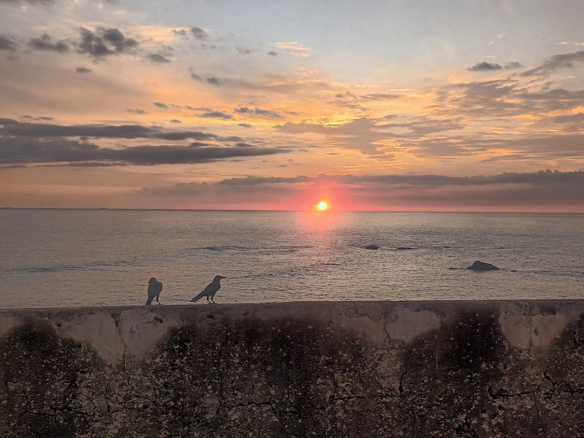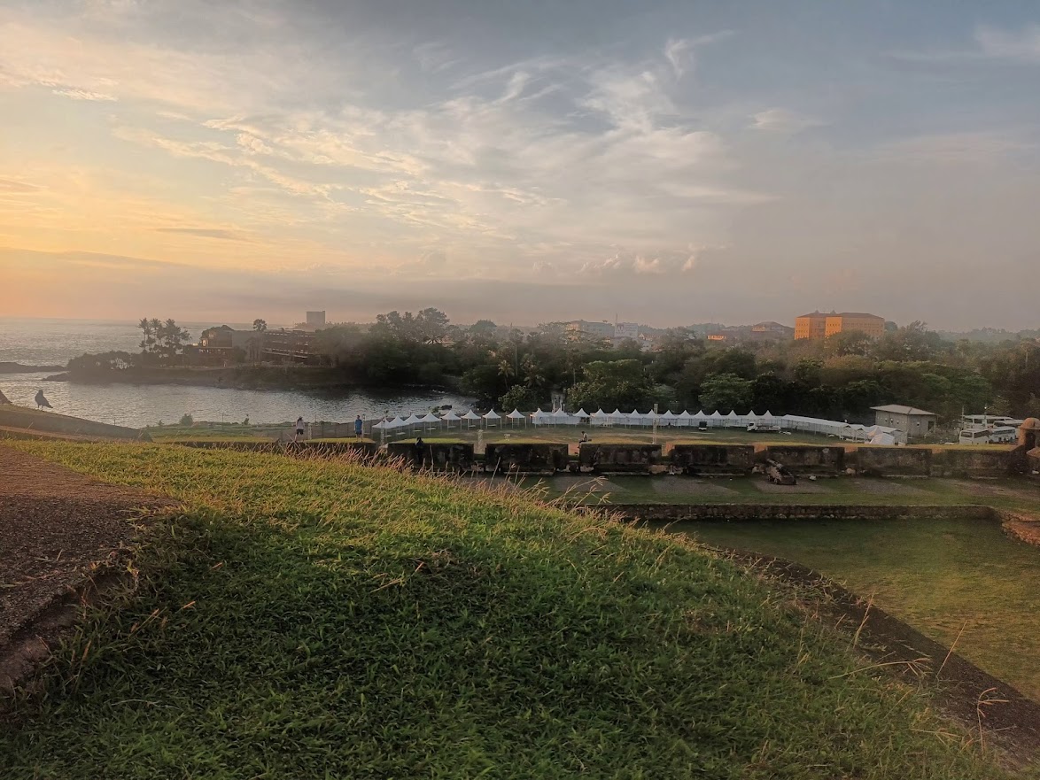 Es herrscht quirliges Treiben, neben der vielen Touristen sieht man auch zahlreiche Einheimische, die hier bei einem Spaziergang den Nachmittag genießen, oder Erfrischungen und Snacks oder Fotos mit ihren exotischen Haustieren wie Pythons anbieten. Auf einer großen Rasenfläche an der Mauer liefern sich Jugendliche trotz der Hitze eine Partie Kricket. Wir kommen an zahlreichen, oft auch historischen, Kirchen, Moscheen und Tempeln vorbei, von denen es hier eine ganze Sammlung gibt, und die uns mal wieder an die religiöse Vielfalt in Sri Lanka erinnern. An der großen Star Bastion am nordwestlichen Ende der Festung beobachten wir zufällig, wie um Punkt sechs Uhr Abends in einer Zeremonie, von Trompetenmusik und einer eingeübten Choreografie von uniformierten Festungswachen die große Landesflagge eingeholt wird, die tagsüber neben dem weithin sichtbaren Uhrenturm weht. Von hier aus bewundern wir auch kurz darauf den beeindruckenden Sonnenuntergang, der sich einem beim Blick hinaus aufs Meer in westlicher Richtung bietet.