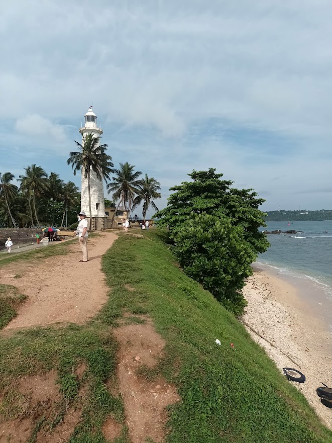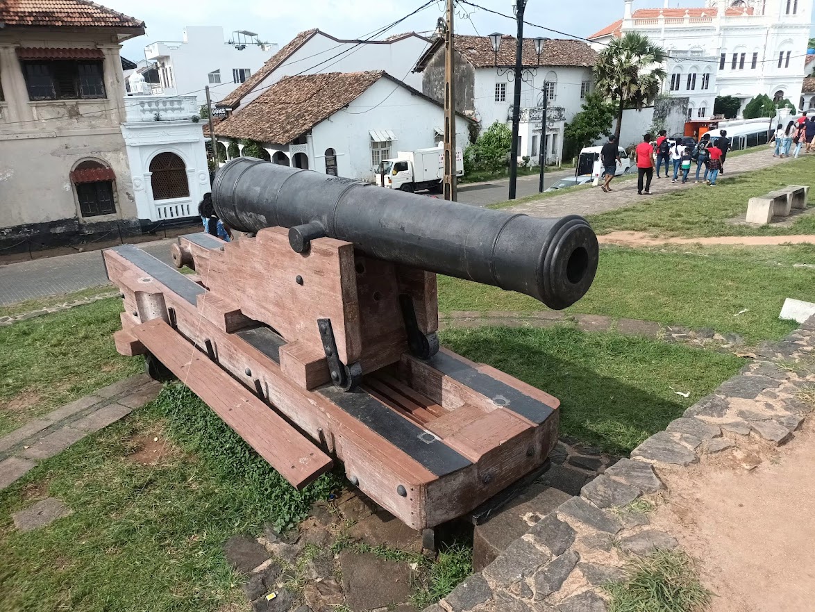 In einem italienischen Restaurant, vollständig mit rot-weiß karierten Tischdecken und alten Weinflaschen an der Wand, das wirklich hervorragend in dieses Setting passt, treffen wir Sabrina. Wir haben sie im Surf Camp in Weligama kennen gelernt, und gemeinsam mit ihr laufen wir einen großen Teil der Festungsmauer ab. Diese ist in großen Teilen keine klassische Mauer, sondern ein mit Steinen verstärkter Erdwall, auf dem man entlangwandern und den Blick aufs Meer und die östlich gelegene Bucht sowie die dunkelroten Ziegeldächer der Altstadt genießen kann. Ein Highlight hier ist der schöne alte Leuchtturm, der an der südöstlichen Ecke der Befestigung weithin sichtbar thront, und den ankommenden Schiffen den Weg nach Galle weist. Zwischendurch gibt es immer wieder kleinere Festungsanlagen, die ins Meer hineinragen und mit gewaltigen historischen Kanonen bestückt sind, und sich ganz besonders gut als Aussichtspunkt und Fotomotiv eignen. Mit gewaltigen historischen Kanonen bestückt, eignen sie sich sowohl als Aussichtspunkt als auch Fotomotiv.