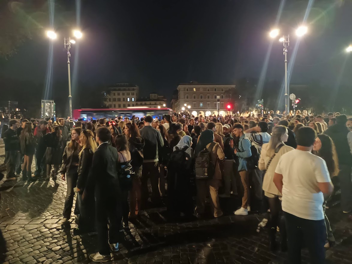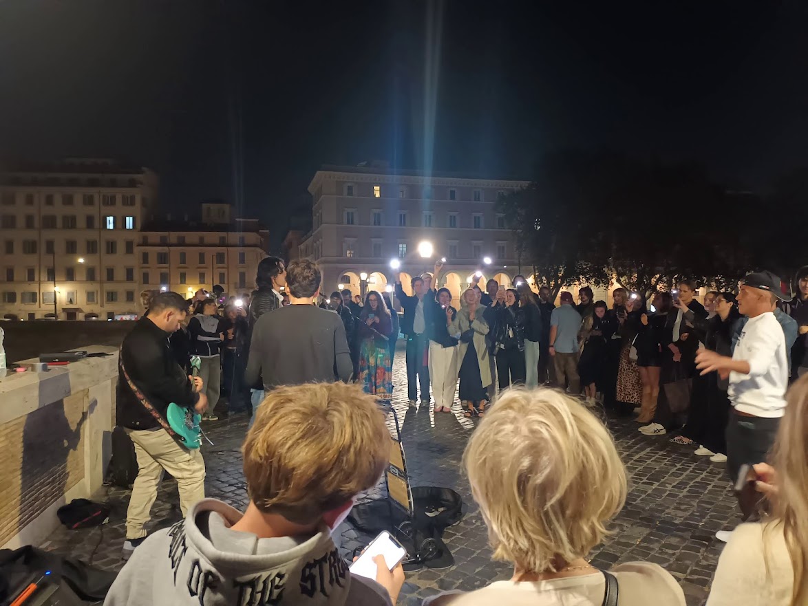 Allein der Versuch, hier mit einer großen Gruppe einen Platz zu kriegen, wirkt auf mich heute eher aussichtslos. In den zahllosen Bars, Cafes und Kneipen, die die Gassen Trasteveres säumen, ist eigentlich jeder Tisch und jeder Stuhl besetzt, und spontan ist hier wohl nur etwas mit wenigen Leuten oder großem Glück zu finden. Heute gleicht der Piazza Trilussa, einer der hauptsächlichen Treffpunkte des Viertels direkt am Tiber, eher einem Volksfest. Selbst zur schon fortgeschrittenen Stunde, als ich dort vorbeikomme und mich zu einer zweiten Pause mit einem Getränk auf der Treppe vor dem Brunnen Fontana di Ponte Sisto niederlasse, finde ich dort kaum einen Sitzplatz auf den Stufen. Um mich herum junge Leute aus aller Welt, die, größtenteils verkleidet, feixen, feiern und flirten, einige schon ziemlich angeschwipst. Es werden Bekanntschaften geschlossen und vertieft, ein überdimensionaler Burrito läuft über den Platz und posiert mit jedem, der will, für ein Handyfoto. Es wollen viele. Auf der Ponte Sisto, die, dem Platz gegenüber liegend, den Fluss überspannt, spielt eine Gruppe Straßenmusiker vor einem begeisterten Publikum. Es ist eine ausgelassene Stimmung, und ich beschließe den Heimweg anzutreten, der mich noch eine knappe Stunde kosten wird.