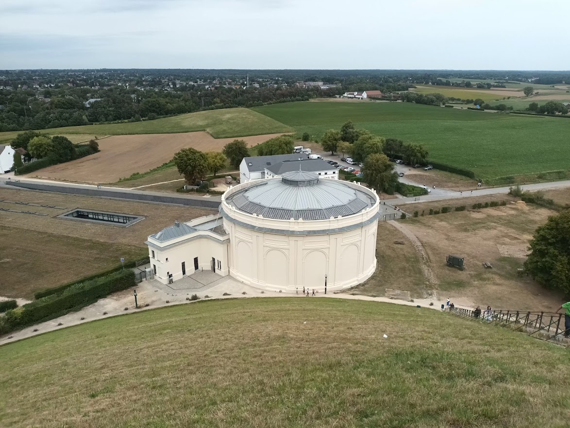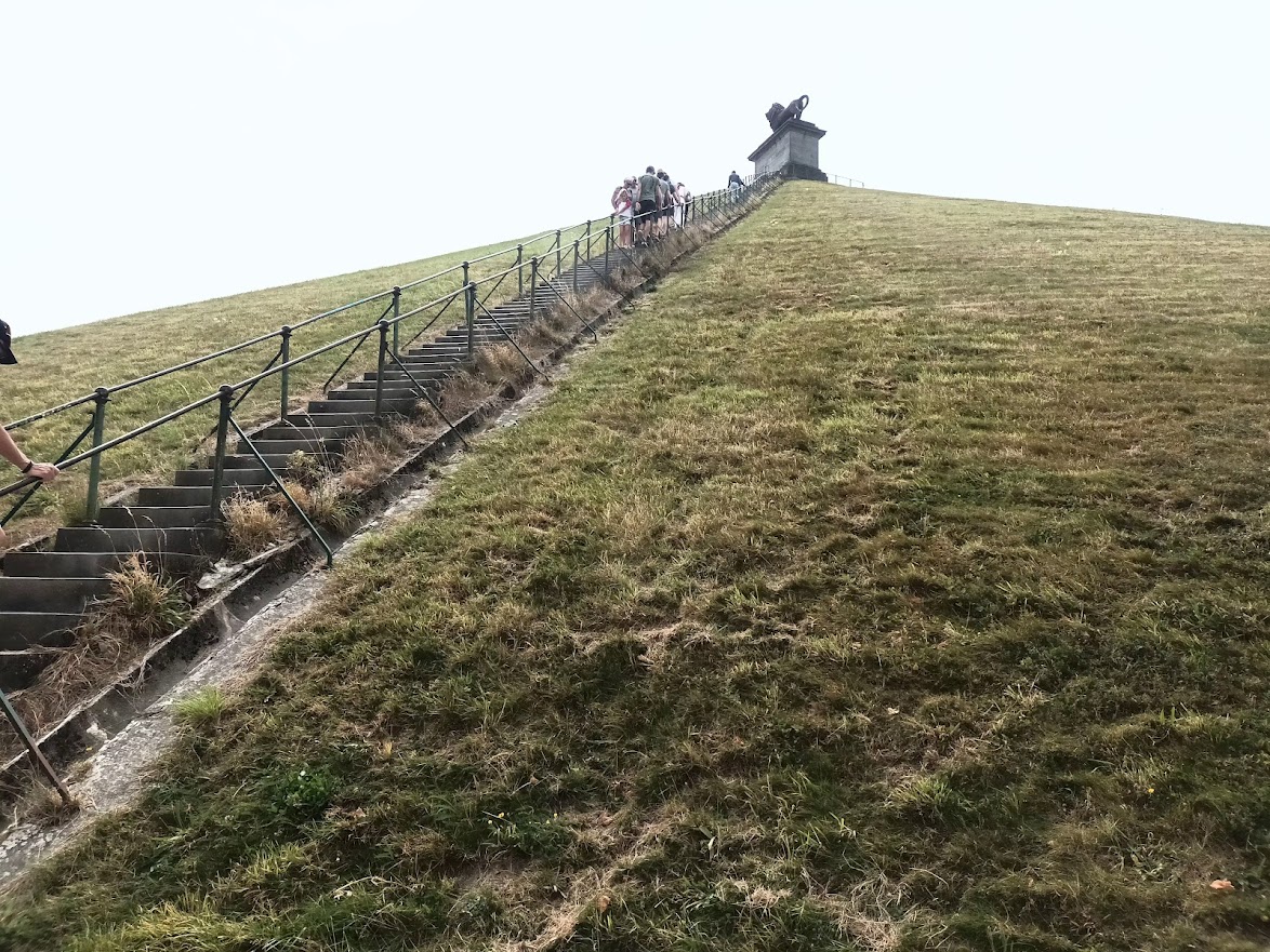 Direkt daneben erhebt sich stolz der 43 Meter hohe Löwenhügel, der bereits gut zehn Jahre nach der Schlacht als Mahnmal aufgeschüttet wurde und mit seiner markanten Form deutlich sichtbar das ehemalige Schlachtfeld überragt. Er kann in 226 Stufen erklommen werden und bietet einen wirklich tollen Blick über die Wiesen und Felder, auf denen sich vor über zweihundert Jahren die Soldaten Frankreichs und der Alliierten gegenseitig abschlachteten. Auf seiner Spitze finden sich nicht nur Ferngläser und Bänke, um die Aussicht noch besser genießen zu können, sondern auch ein kolossaler Löwe aus Eisen. Dieser repräsentiert, in Richtung Frankreichs blickend, das Wappentier einiger beteiligter Siegerparteien und den gewaltigen Triumph, der an diesem Tag errungen wurde. Angeblich wurde er aus erbeuteten französischen Kanonen gegossen.