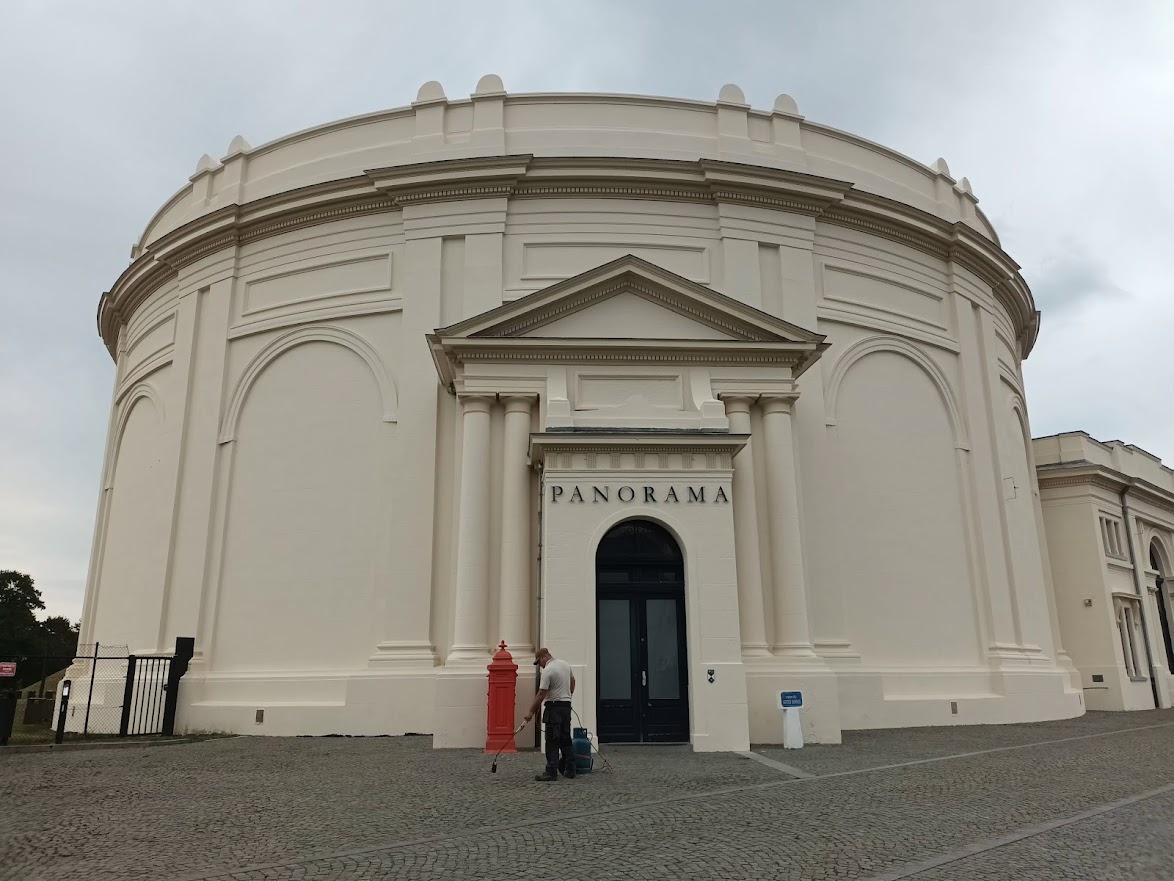 Nach dieser intensiven Auseinandersetzung mit den historischen Hintergründen kann man dann an die frische Luft und das eigentliche Schlachtfeld begutachten. Das heißt fast, denn zunächst geht es in ein altehrwürdiges separates Gebäude, in dem azf einem großflächigen Panoramagemälde die Schlacht von Waterloo in beeindruckender Größe auf die Leinwand gebannt wurde. Zusammen mit einigen lebensgroßen Nachbildungen von toten Menschen, Pferden und Kriegsmaterial steht der Besucher staunend inmitten dieses Gebildes und kann im 360-Grad-Blick das Panorama erkunden.